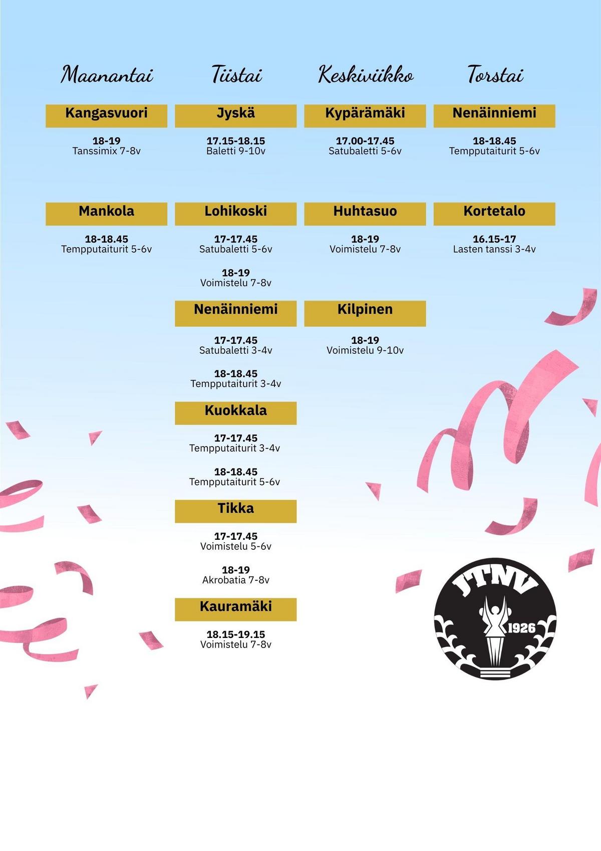 Tulevalla toimintakaudella meillä on tarjolla seuraavia tunteja: -satubaletti -baletti -tempputaiturit -akrobatia -lasten tanssi -tanssimix -voimistelu -perhejumppa Lukujärjestys julkaistaan ja…